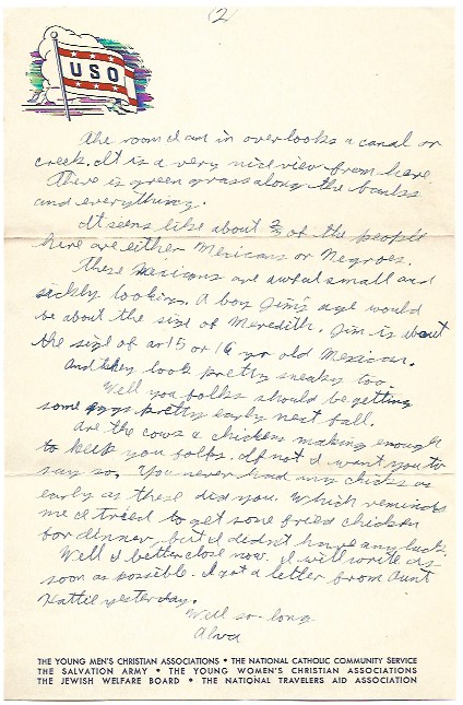 It seems like about 2/3 of the people here are either Mexicans or Negroes. These Mexicans are awful small and sickly looking. A boy Jim’s age would be about the size of Meredith. Jim is about the size of a 15 or 16 yr. old Mexican. And they look pretty sneaky too.
