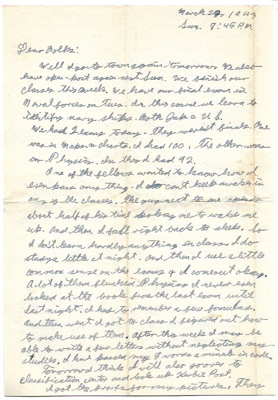 Well I go to town again tomorrow. We also have open-post again next Sun. We finish our classes this week. We have our final exam in naval forces on Tues. In this course we learn to identify navy ships. Both Jap and U.S. We had 2 exams today. They weren’t finals. One was in maps & charts. I had 100. The other was on Physics. In this I had 92.