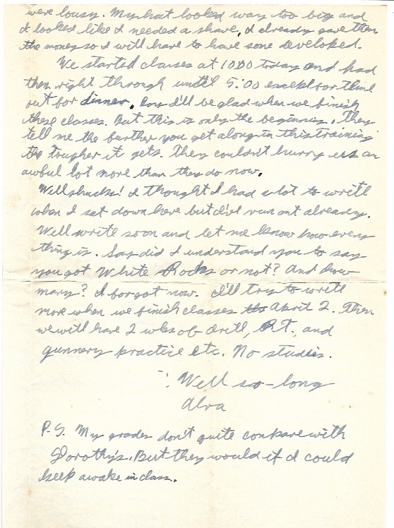 Well shucks! I thought I had a lot to write when I sat down here but I’ve run out already. Well write soon and let me know how everything is. Say did I understand you to say you got White Rocks or not? And how many? I forgot now. I’ll try to write more when we finish classes April 2. Then we will have 2 wks of drill, P.T., and gunnery practice etc. No studies.
