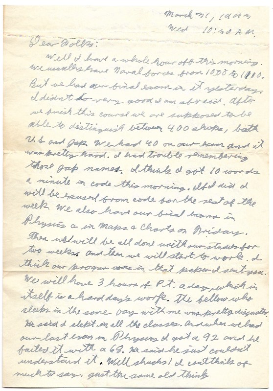 Well I have a whole hour off this morning. We usually have Naval Forces from 10:00 to 11:00. But we had our final exam on it yesterday. I didn’t do very good I am afraid. After we finish this course we are supposed to be able to distinguish between 400 ships, both U.S. and Jap. We had 40 on our exam and it was pretty hard. I had trouble remembering those Jap names. I think I got 10 words a minute in code this morning. If I did I will be excused from code for the rest of the week. We also have our final exam in Physics and in Maps & Charts on Friday. Then we will be all done with our studies for two weeks and then we will start to work. I think our program was in that paper I sent you. We will have 3 hours of P.T. a day, which in itself is a hard day’s work. The fellow who sleeps in the same bay with me was pretty disgusted. He said I slept in all the classes. And when we had our last exam in Physics I got a 92 and he failed it with a 68. He said he just couldn’t understand it. Well shucks I can’t think of much to say. Just the same old thing.