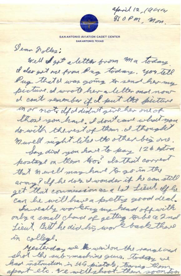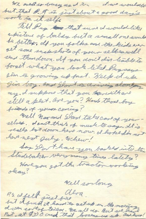 Tell Pug that sure I would like a picture of baldy but a small one would be better. If you folks and the kids ever get some snapshots of yourselves, well send them down. If you don’t, I’m liable to forget what you look like. Pug says Jim is growing up fast. Keep it up Jim boy. And Dort is driving alone, my my. I suppose that you, Meredith, are still a pest. Are you? How’s those boyfriends of yours coming?