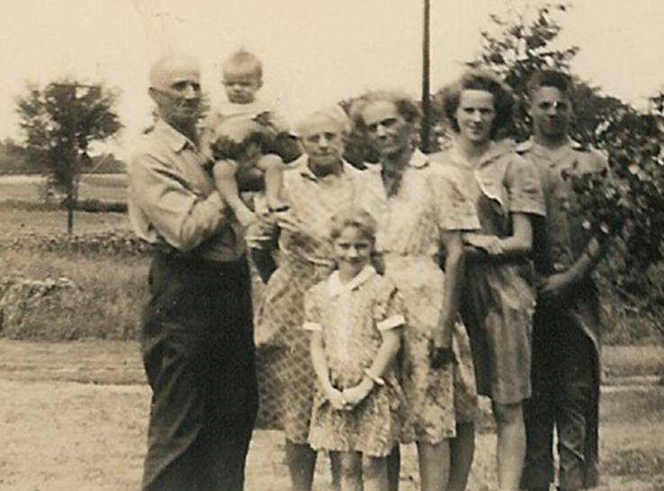 Left to right: Clarence Bessey (Alva’s father), baby in arms is “Baldy” (sister Pearl’s son Clarence), Aunt Hattie (Clarence’s sister), Ethel Bessey (mother), Dorothy (sister), Jim (brother), and Meredith (sister) in front