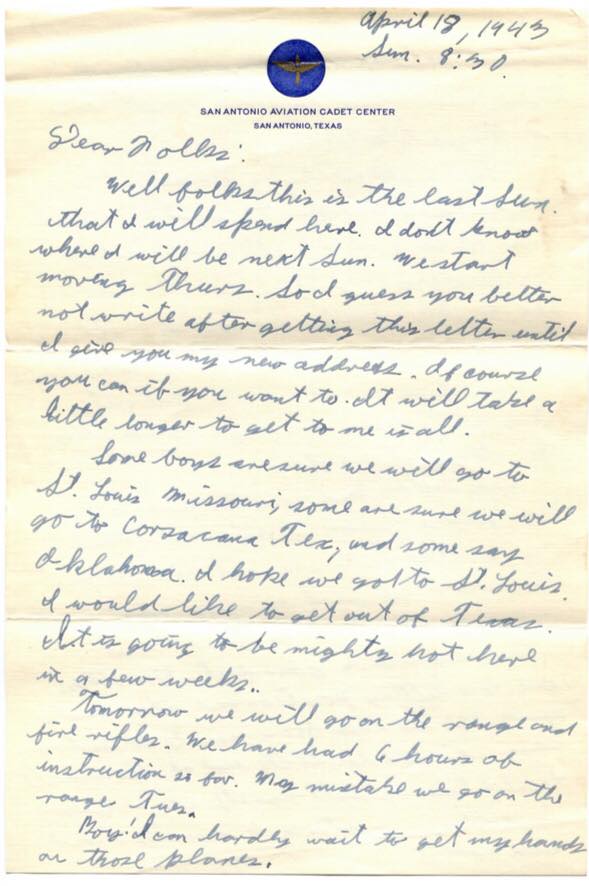 Some boys are sure we will go to St. Louis, Missouri. Some are sure we will go to Corsicana, Tex, and some say Oklahoma. I hope we get to go to St. Louis. I would like to get out of Texas. It is going to be mighty hot here in a few weeks.