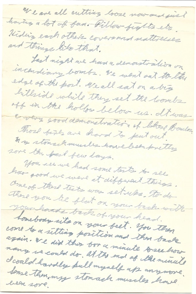 Last night we had a demonstration on incendiary bombs. We went out to the edge of the post. We all sat on a big hillside while they set the bombs off in the hollow below us. It was a very good demonstration of these bombs. Those fires are hard to put out.