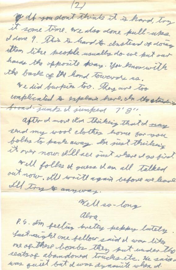 Well folks this is the last Sun. that I will spend here. I don’t know where I will be next Sun. We start moving Thurs. So I guess you better not write after getting this letter until I give you my new address. Of course you can if you want to. It will take a little longer to get to me is all.