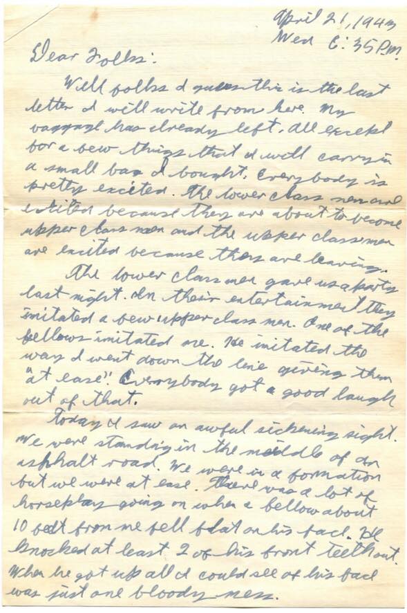 Today I saw an awful sickening sight. We were standing in the middle of an asphalt road. We were in a formation but we were at ease. There was a lot of horseplay going on when a fellow about 10 feet from me fell flat on his face. He knocked at least 2 of his front teeth out. When he got up all I could see of his face was just one bloody mess.