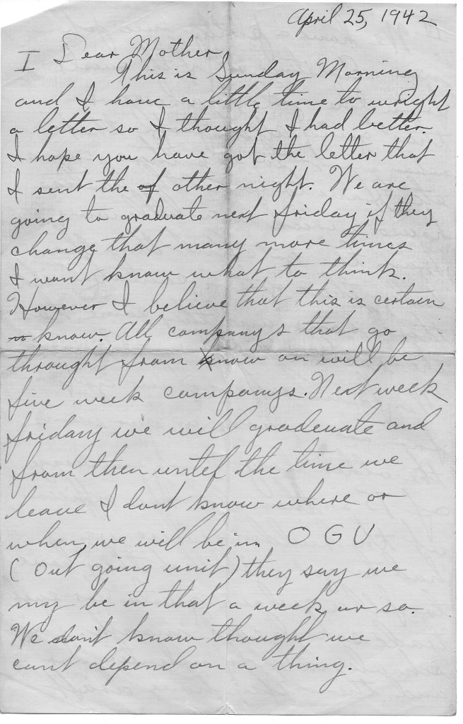 This is Sunday morning and I have a little time to write a letter so I thought I had better. I hope you got the letter that I sent the other night. We are going to graduate next Friday. If they change that many more times I won’t know what to think. However, I believe that this is certain now. All companies that go through from now on will be five week companies. Next week Friday we will graduate and from then until the time we leave I don’t know where or when we will be in OGU (outgoing unit). They say we may be in that a week or so. We don’t know though. We can’t depend on a thing.