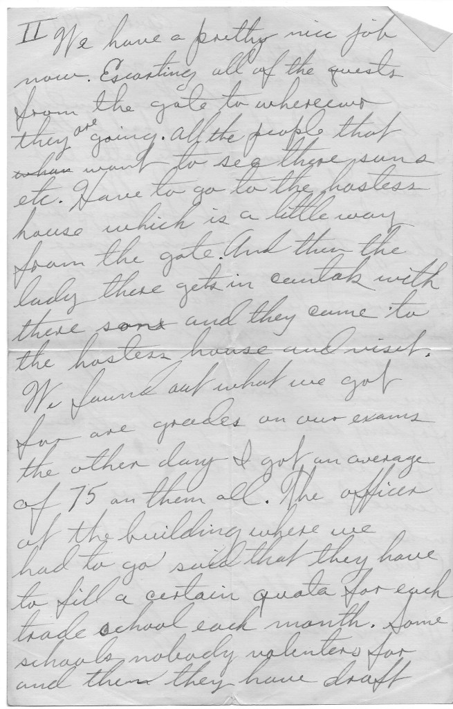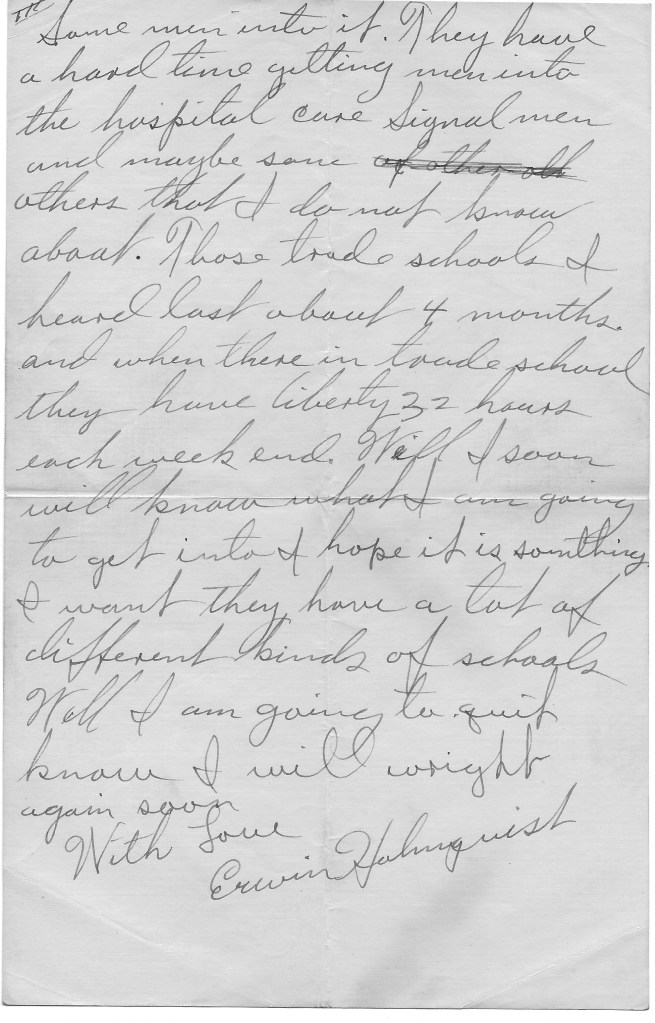 The officer of the building where we had to go said that they have to fill a certain quota for each trade school each month. Some schools nobody volunteers for and then they have to draft some men into it. They have a hard time getting men into the hospital care, signal men, and maybe some others that I do not know about. Those trade schools I heard last about four months and when they’re in trade school, they have liberty 32 hours each weekend.