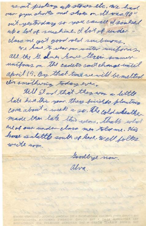 We have to wear our winter uniforms. All the G.I. men have their summer uniforms on. The cadets can’t change until April 15. By that time we will be melted. I’m smothering today even.