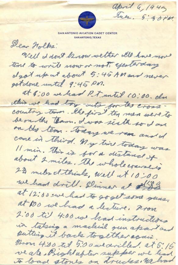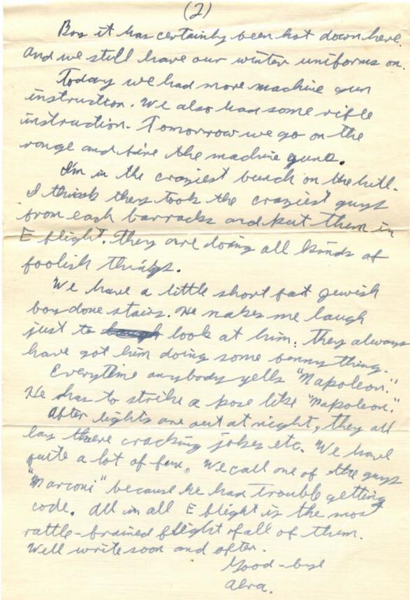 We have a little short fat Jewish boy downstairs. He makes me laugh just to look at him. They always have got him doing some funny thing. Every time anybody yells “Napoleon” he has to strike a pose like “Napoleon”. After lights out at night, they all lay there cracking jokes, etc. We have quite a lot of fun. We call one of the guys “Marconi” because he had trouble getting code. All in all E Flight is the most rattle-brained flight of all of them. Well write soon and often.