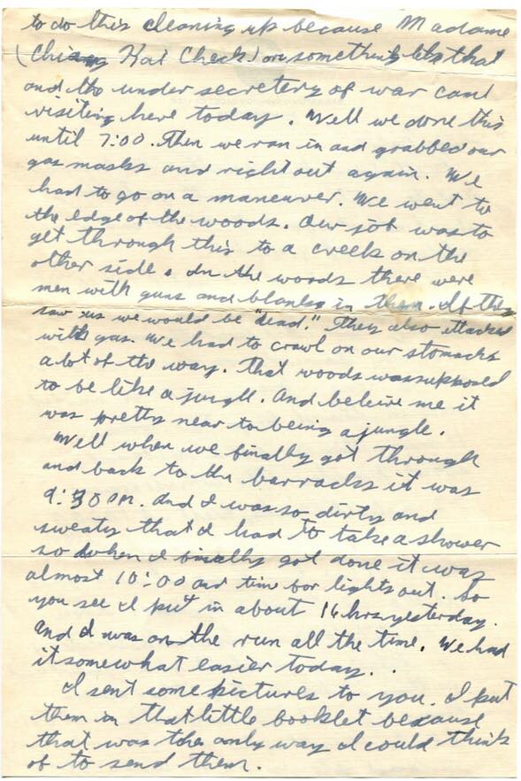 Right after supper we had to load stones on trucks. We had to do this cleaning up because Madame Chiang Kai-shek or something like that and the under secretary of war came visiting here today. Well we done this until 7:00. Then we ran in and grabbed our gas masks and right out again. We had to go on a maneuver. We went to the edge of the woods. Our job was to get through this to a creek on the other side. In the woods there were men with guns and blanks in them. If they saw us we would be “dead.” They also attacked with gas. We had to crawl on our stomachs a lot of the way. That woods was supposed to be like a jungle. And believe me, it was pretty near to being a jungle. Well when we finally got through and back to the barracks it was 9:30 P.M. And I was so dirty and sweaty that I had to take a shower. So when I finally got done it was almost 10:00 and time for lights out. So you see I put in about 16 hrs. yesterday. And I was on the run all the time. We had it somewhat easier today.