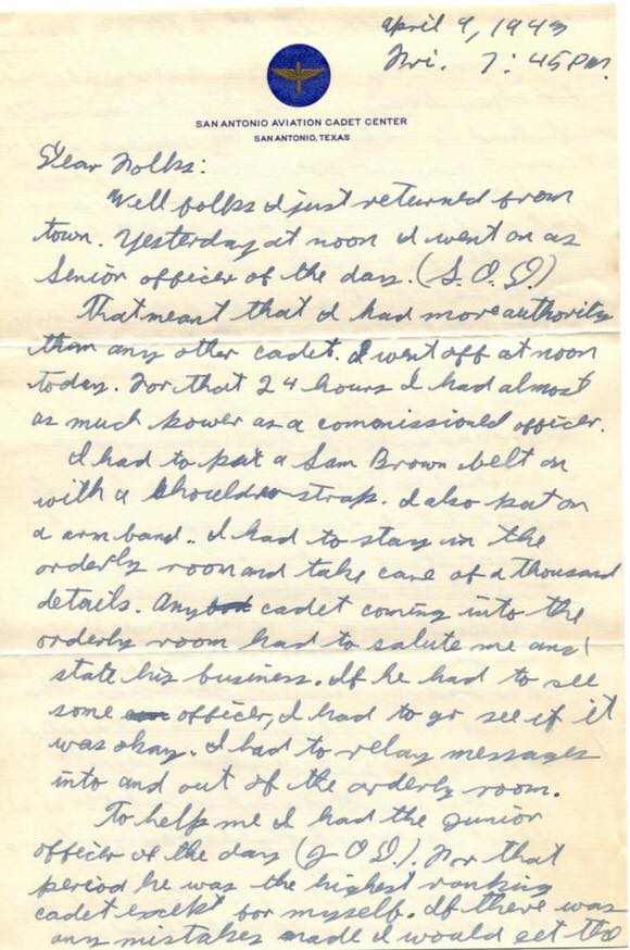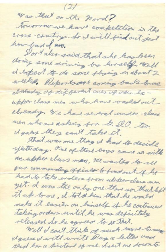Dort also said that she has been doing some driving by herself. Well I expect to do some flying in about 2 weeks. Reports are coming back to us already of different ones of our ex-upper class men who have washed out already. We have several under class men who are asking for G.D.O. too. I guess they can’t take it.