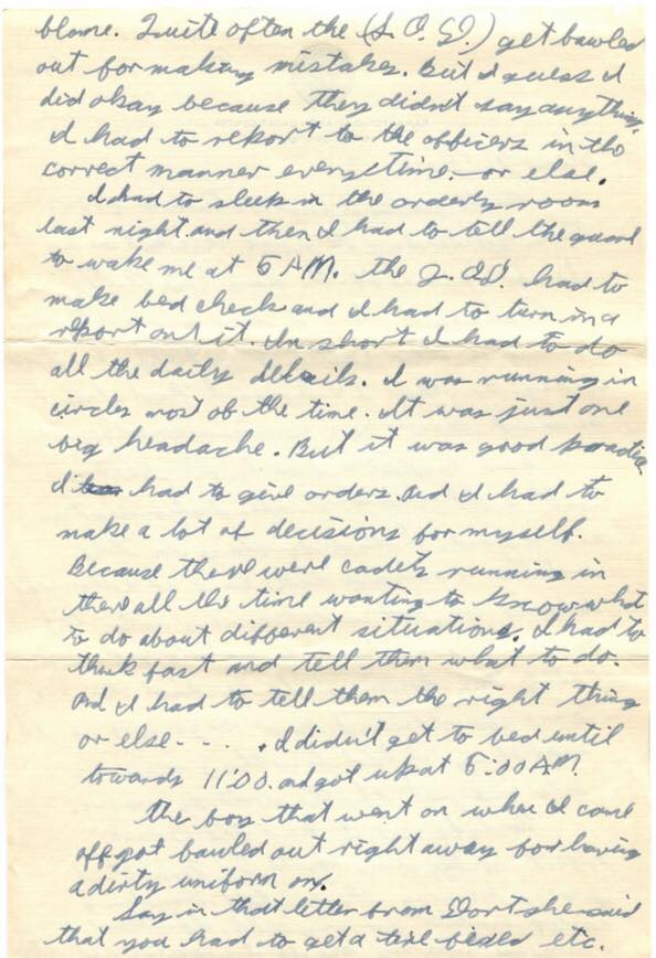 I had to sleep in the orderly room last night and then I had to tell the guard to wake me at 5 A.M. The J.O.D. had to make bed checks and I had to turn in a report on it. In short, I had to do all the daily details. I was running in circles most of the time. It was just one big headache. But it was good practice. I had to give orders and I had to make a lot of decisions for myself. Because there were cadets running in there all the time wanting to know what to do about different situations, I had to think fast and tell them what to do. And I had to tell them the right thing or else…… I didn’t get to bed until towards 11:00 and got up at 5:00 A.M.