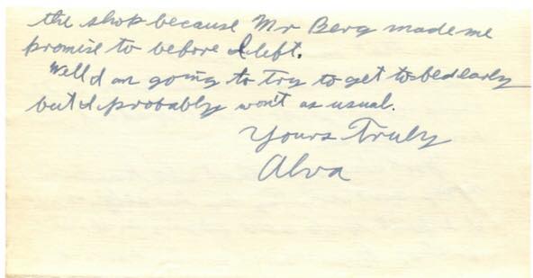 Well I can’t think of much more to say. I guess I will write Pug a letter and send her a picture of me. I sent one down to the shop because Mr. Berg made me promise to before I left.