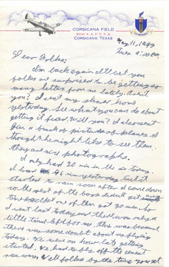 I’m back again. I’ll bet you folks are surprised to be getting so many letters from me lately, aren’t you? I sent my shaver home yesterday. See what you can do about getting that fixed, will you? I also sent Jim a bunch of pictures of planes. I thought he might like to see them. They are nice photographs.
