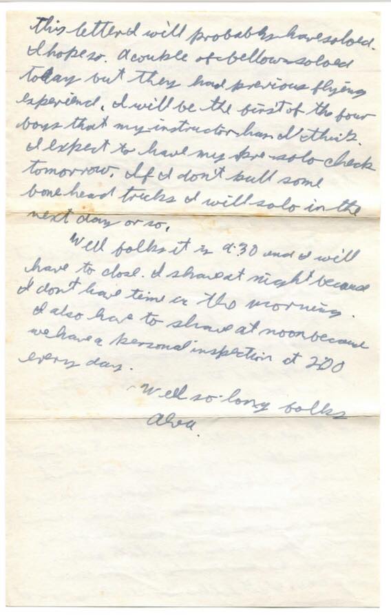 I only had 20 min in the air today. I had 46 min yesterday but it started to rain soon after I came down so the rest of the boys didn’t get any time except one of them got 30 min. So I went last today and there was only a little time left for me. This was because there was some doubt about us flying today. We were an hour late getting started. We had to fly off the cement runway. Well folks by the time you get this letter I will probably have soloed. I hope so. A couple of fellows soled today but they had previous flying experience. I will be the first of the four boys that my instructor has I think. I expect to have my pre solo check tomorrow. If I don’t pull some bonehead tricks I will solo in the next day or so.