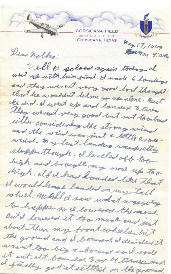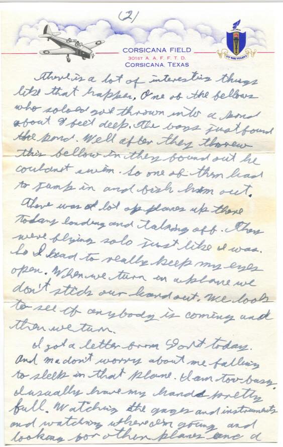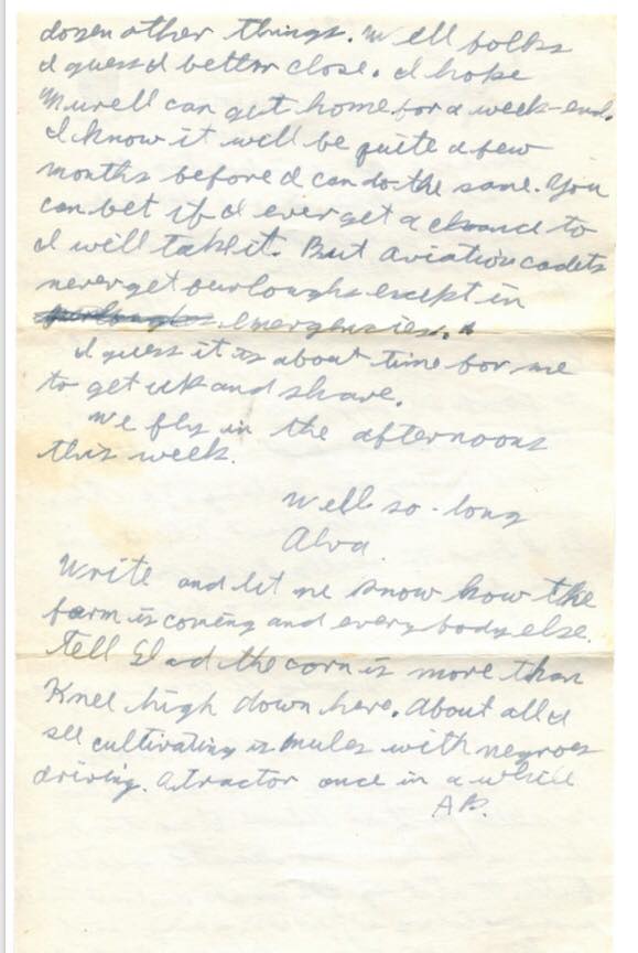 Well folks I guess I better close. I hope Murell can get home for a weekend. I know it will be quite a few months before I can do the same. You can bet if I ever get a chance to I will take it. But aviator cadets never get furloughs except in emergencies.
