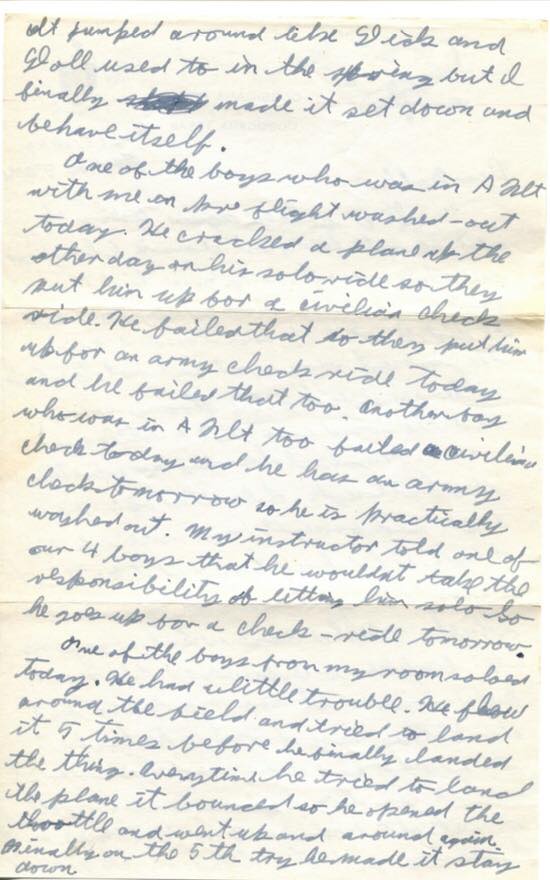 One of the boys who was in A Flt. with me on pre-flight washed-out today. He cracked a plane up the other day on his solo ride so they put him up for a civilian check ride. He failed that so they put him up for an army check ride today and he failed that too. Another boy who was in A Flt too failed civilian check today and he has an army check tomorrow so he is practically washed out. My instructor told one of our 4 boys that he wouldn’t take the responsibility of letting him solo so he goes up for a check-ride tomorrow.