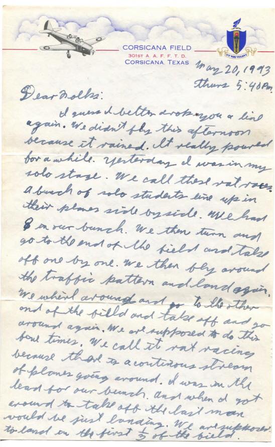 I guess I better drop you a line again. We didn’t fly this afternoon because it rained. It really poured for a while. Yesterday I was in my solo stage. We call these rat races. A bunch of solo students line up in their planes side by side. We had 8 in our bunch. We then turn and go to the end of the field and take off one by one. We then fly around the traffic pattern and land again. We whirl around and go to the other end of the field and take off and go around again. We are supposed to do this four times. We call it rat racing because there is a continuous stream of planes going around. I was in the lead for our bunch and when I got around to take off the last man would be just landing. We are supposed to land in the first 1/3 of the field.