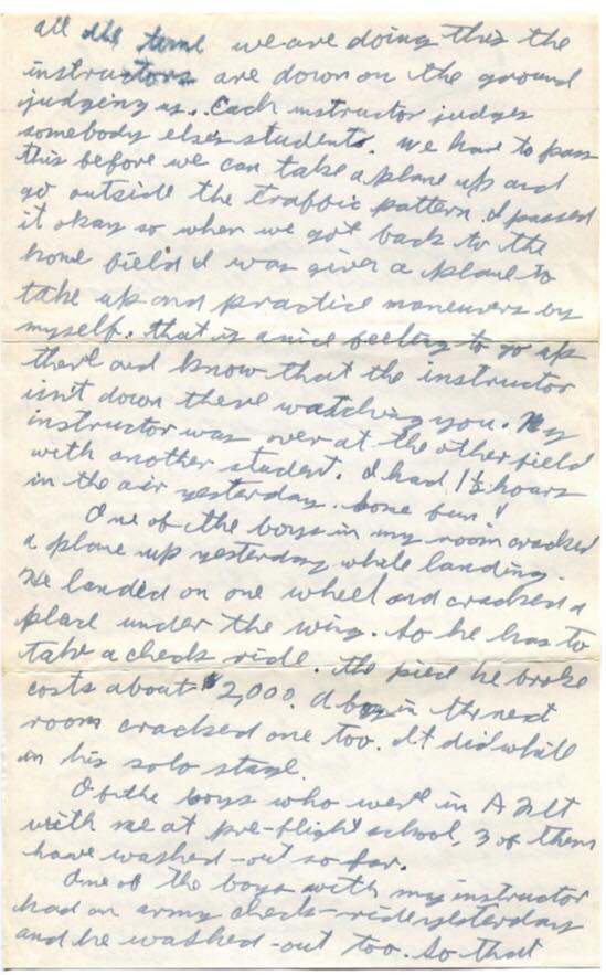 One of the boys in my room cracked a plane up yesterday while landing. He landed on one wheel and cracked a place under the wing. So he has to take a check ride. The piece he broke costs about $2,000. A boy in the next room cracked one too. It did while in his solo stage.
