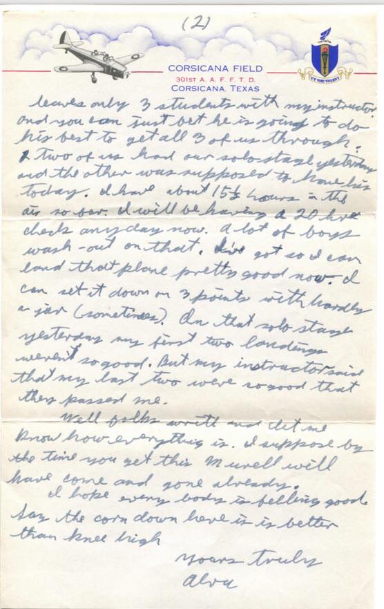 Of the boys who were in A Flt with me at pre-flight school, 3 of them have washed out so far. One of the boys with my instructor had an army check ride yesterday and he washed out too. So that leaves only 3 students with my instructor and you can just bet he is going to do his best to get all 3 of us through. Two of us had our solo stage yesterday and the other was supposed to have his today. I have about 15 1/2 hours in the air so far. I will be having a 20 hr check any day now. A lot of boys wash-out on that.