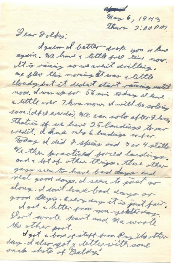 I guess I better drop you a line again. We have a little free time now. It is raining so we aren’t drilling. We flew this morning. It was a little cloudy but it didn’t start raining until noon. I was up for 56 min today. I have a little over 7 hrs now. I will be soloing soon (If I ever do). We can solo after 8 hrs, that is if we have 25 landings to our credit. I have only 6 landings so far. Today I did 2 spins and 3 or 4 stalls. We then practiced forced landings and a lot of other things. Those other guys seem to have bad days and real good days. I seem to just go along. I don’t have bad days or good days. Every day it is just fair.
