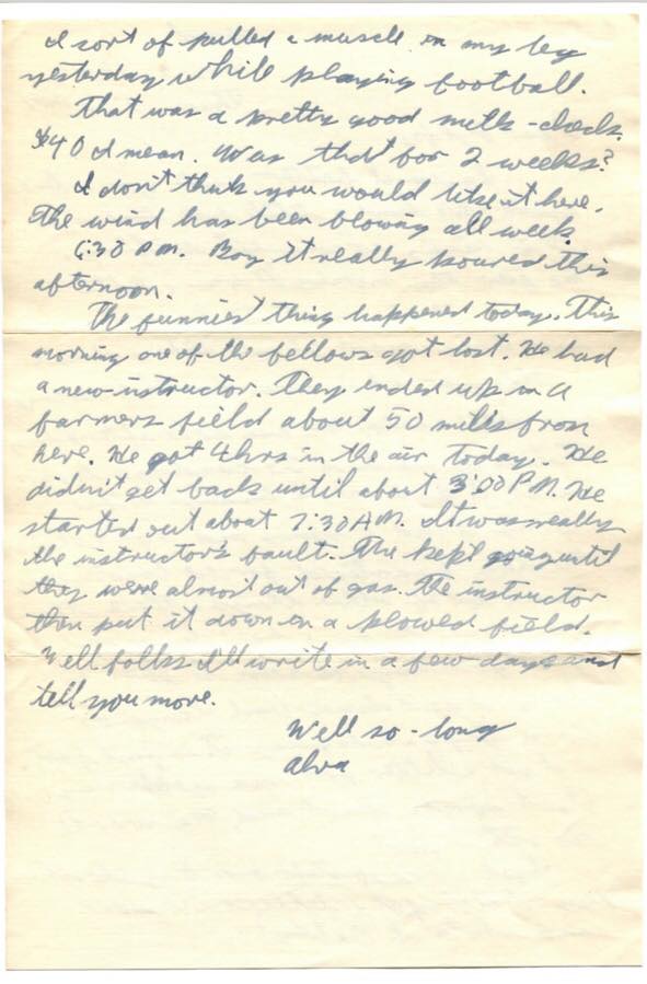 The funniest thing happened today. This morning one of the fellows got lost. He had a new instructor. They ended up in a farmer’s field about 50 miles from here. He got 4 hrs in the air today. He didn’t get back until about 3:00 P.M. He started out about 7:30 A.M. It was really the instructor’s fault. They kept going until they were almost out of gas. The instructor then put it down in a plowed field.