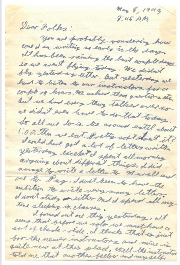 You are probably wondering how come I am writing so early in the day. It has been raining the last couple days so we aren’t flying today. We didn’t fly yesterday either. But yesterday we had to listen to our instructors for a couple of hours. We asked them questions etc. But we had everything talked over so we didn’t even have to do that today. So all we do is lie around until about 1:00. Then we eat. Pretty soft, isn’t it? I could have got a lot of letters written yesterday except I spent all morning arguing about different things. I did manage to write a letter to Murell and one to Pug. I don’t seem to have the ambition to write very many letters. I don’t study either. And I spend all my time sleeping in classes.