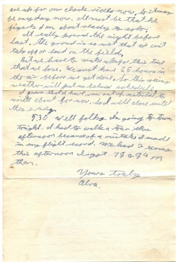 5:30 . Well folks I’m going to town tonight. I had to walk a tour this afternoon because of a mistake I made in my flight record. We had 2 exams this afternoon. I got 78 and 80 on them.