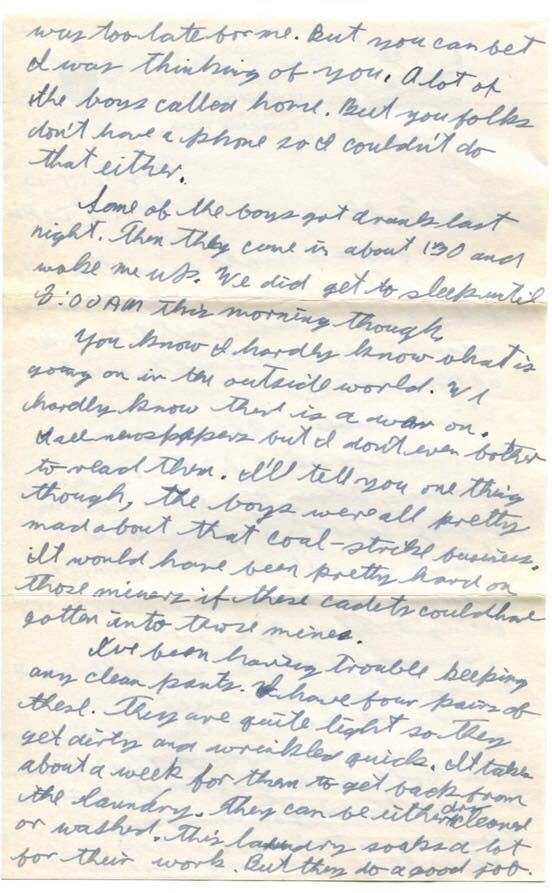 You know I hardly know what is going on in the outside world. We hardly know there is a war on. I see newspapers but I don’t even bother to read them. I’ll tell you one thing though, the boys were all pretty mad about that coal-strike business. It would have been pretty hard on those minors if these cadets could have gotten into those mines.