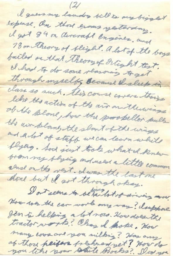 On those exams yesterday I got 84 on Aircraft Engines and 78 on Theory of Flight. A lot of the boys failed on that Theory of Flight test. I had to do some reasoning to get through myself because I sleep in class so much. This course covers things like the action of the air on the wings of the plane, how the propellor pulls the airplane, the slant of the wings and a lot of stuff we can learn while flying. So I just took what I know from my flying and used a little common sense on the rest. I was the last one done but I got through okay.