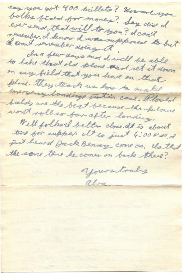 Well folks I better close. It is about time for supper. It is just 6:00 P.M. I just heard Jack Benny come on. Is that the same time he comes on back there?