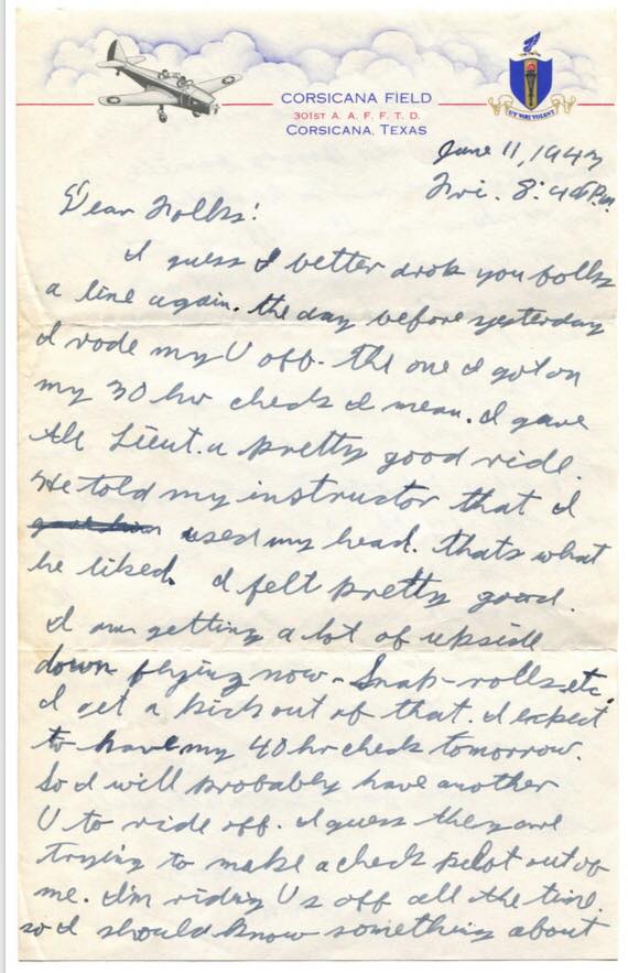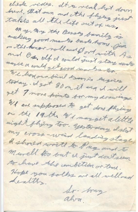 I am getting a lot of upside down flying now–snap rolls etc. I get a kick out of that. I expect to have my 40 hr check tomorrow. So I will probably have another U to ride off. I guess they are trying to make a check pilot out of me. I’m riding U’s off all the time so I should know something about check rides. It’s real hot down here. That sun and the flying just takes all the life out of us.
