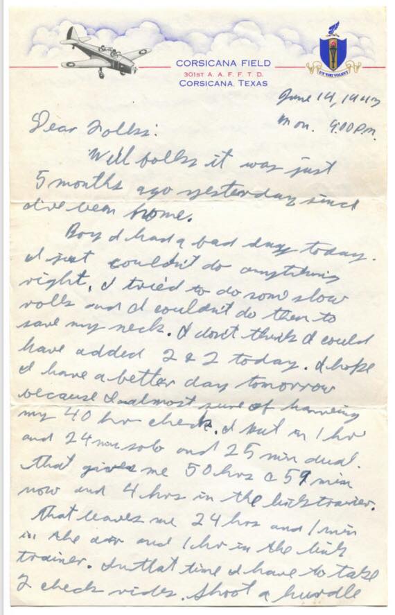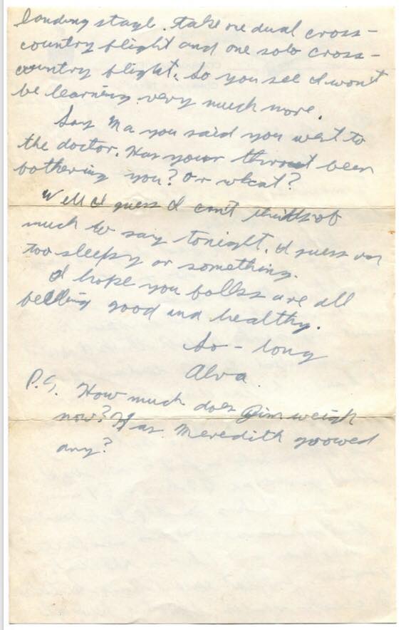 Boy I had a bad day today. I just couldn’t do anything right. I tried to do some slow rolls and I couldn’t do them to save my neck. I don’t think I could have added 2 & 2 today. I hope I have a better day tomorrow because I’m almost sure of having my 40 hr check. I put in 1 hr and 24 min solo and 25 min dual. That gives me 50 hrs and 59 min now and 4 hrs. in the link trainer. That leaves me 24 hrs and 1 min in the air and 1 hr in the link trainer. In that time I have to take 2 check rides, shoot a