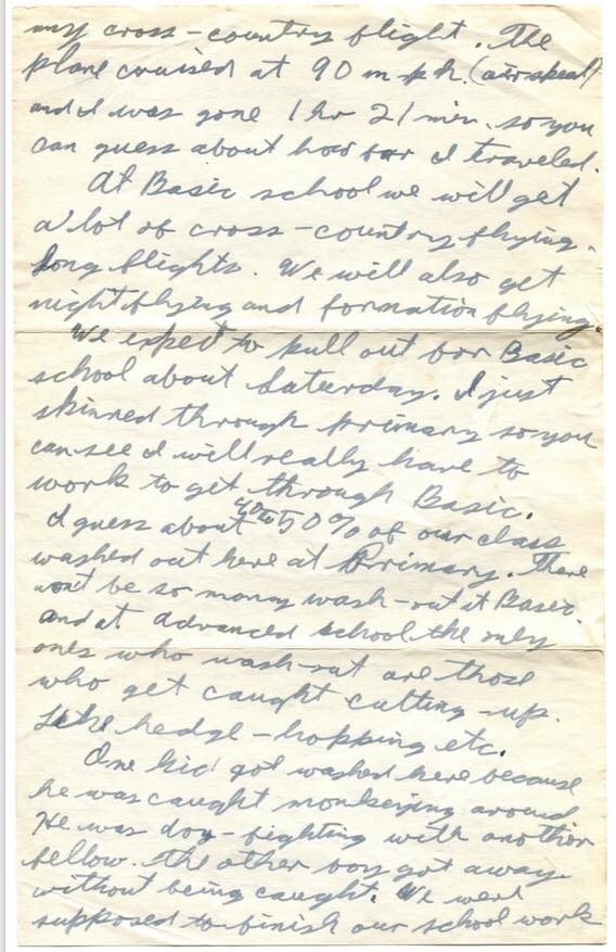 We expect to pull out for Basic school about Saturday. I just skimmed through Primary so you can see I will really have to work to get through Basic. I guess about 40-50% of our class washed out here at Primary. There won’t be so many wash-outs at Basic. And at Advanced school the only ones who wash out are those who get caught cutting up. Like Hedge-hopping etc. One kid got washed here because he was caught monkeying around. He was dog-fighting with another fellow. The other boy got away without being caught.