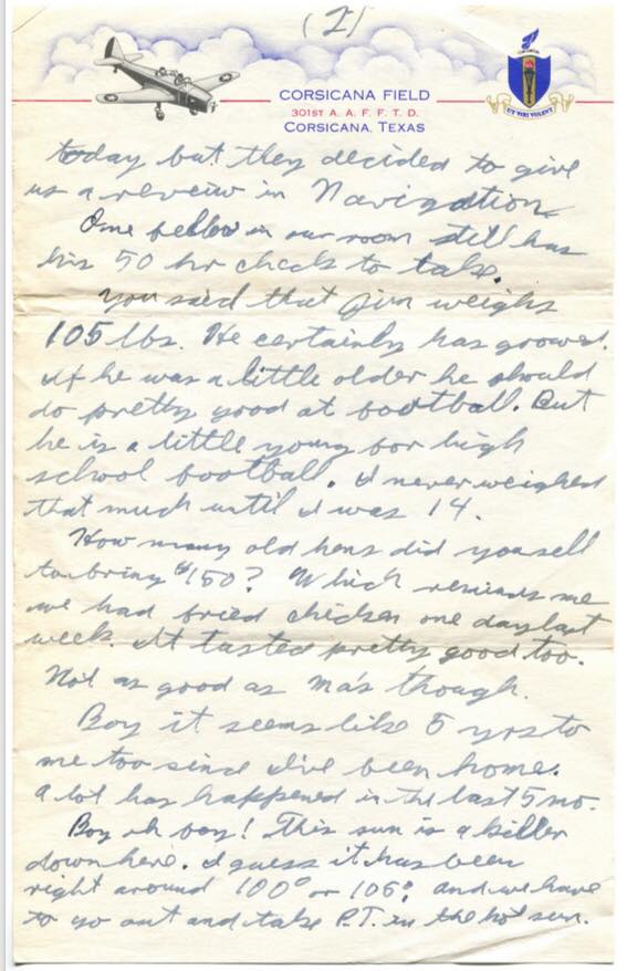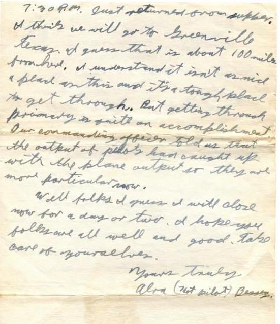 7:30 P.M. Just returned from supper. I think we will go to Greenville, Texas. I guess that is about 100 miles from here. I understand it isn’t as nice a place as this, and it’s a tough place to get through. But getting through Primary is quite an accomplishment. Our commanding officer told us that the output of pilots had caught up with the plane output so they are more particular now.