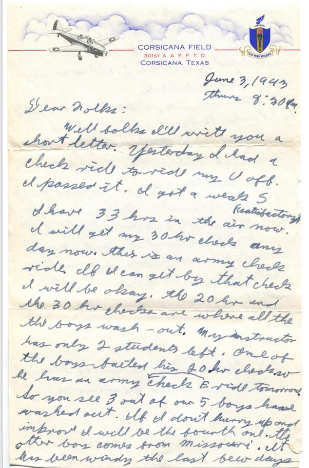 Well folks I’ll write you a short letter. Yesterday I had a check ride to ride my U off. I passed it. I got a weak S (satisfactory). I have 33 hrs in the air now. I will get my 30 hr check any day now. This is an army check ride. If I can get by that check I will be okay. The 20 hr and the 30 hr checks are where all the boys wash-out. My instructor has only 2 students left. One of the boys failed his 20 hr check so he has an army E check ride tomorrow. So you can see 3 out of our 5 boys have washed out. If I don’t hurry up and improve I will be the fourth one. The other boy comes from Missouri. It has been windy the last few days so every time I try to land I bounce all over the field. Another one of the boys in our room washed out yesterday. It was on his 20 hr check.