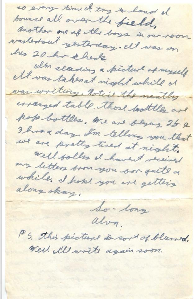 I’m sending a picture of myself. It was taken at night while I was writing. Notice the neatly arranged table. Those bottles are pop bottles. We are flying 2 1/2 to 3 hrs a day. I’m telling you that we are pretty tired at night.