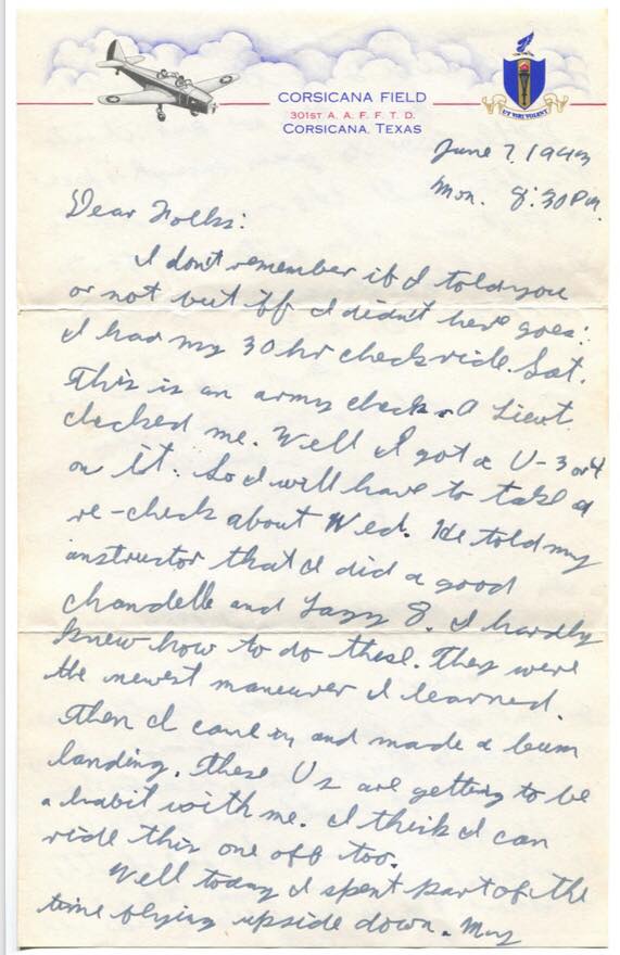 I don’t remember if I told you or not but if I didn’t here goes: I had my 30 hr check ride Sat. This is an army check ride so a Lieut checked me. Well I got a U-3 or 4 on it. So I will have to take a re-check about Wed. He told my instructor that I did a good chandelle and Lazy 8. I hardly knew how to do these. They were the newest maneuver I learned. Then I came in and made a bum landing. These U’s are getting to be a habit with me. I think I can ride this one off too.