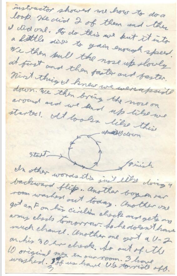 Well today I spent part of the time flying upside down. My instructor showed me how to do a loop. He did 2 of them and then I did one. To do this we put it into a little dive to gain enough speed. We then pull the nose up slowly at first and then faster and faster. First thing I knew we were upside down. We then bring the nose on around and we end up like we started. It looks like this (see original letter).