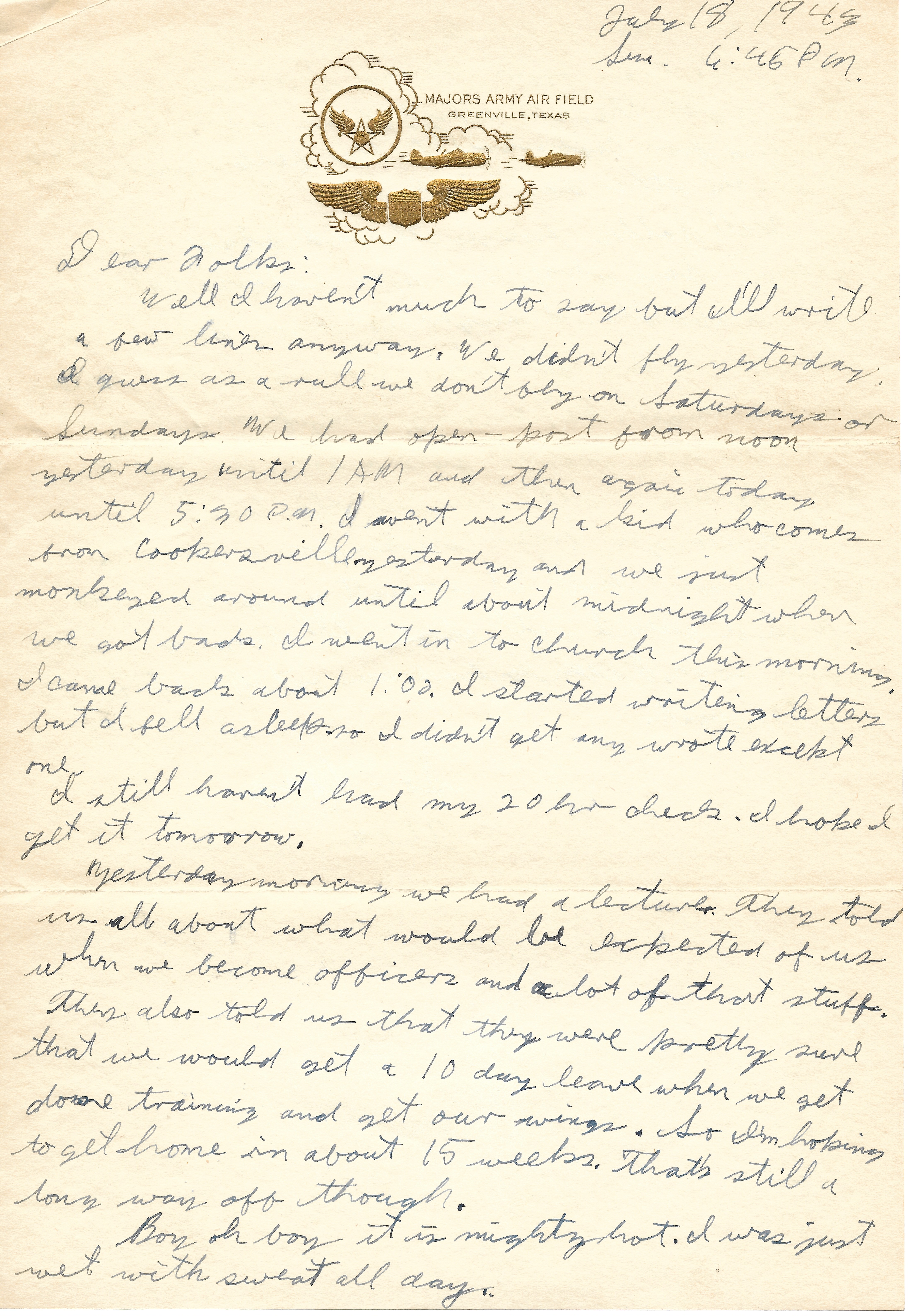 Well I haven’t much to say but I’ll write a few lines anyway. We didn’t fly yesterday. I guess as a rule we don’t fly on Saturdays or Sundays. We had open post from noon yesterday until 1 A.M. and then again today until 5:30 P.M. I went with a kid who comes from Coopersville yesterday and we just monkeyed around until about midnight when we got back. I went in to church this morning. I came back about 1:00. I started writing letters but I fell asleep so I didn’t get any written except one.