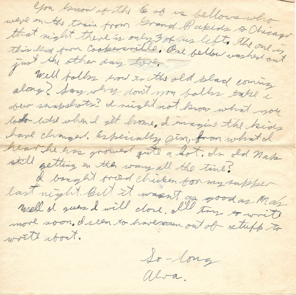 I bought fried chicken for my supper last night. But it wasn’t as good as Ma’s. Well I guess I will close. I’ll try to write more soon. I seem to have run out of stuff to write about.