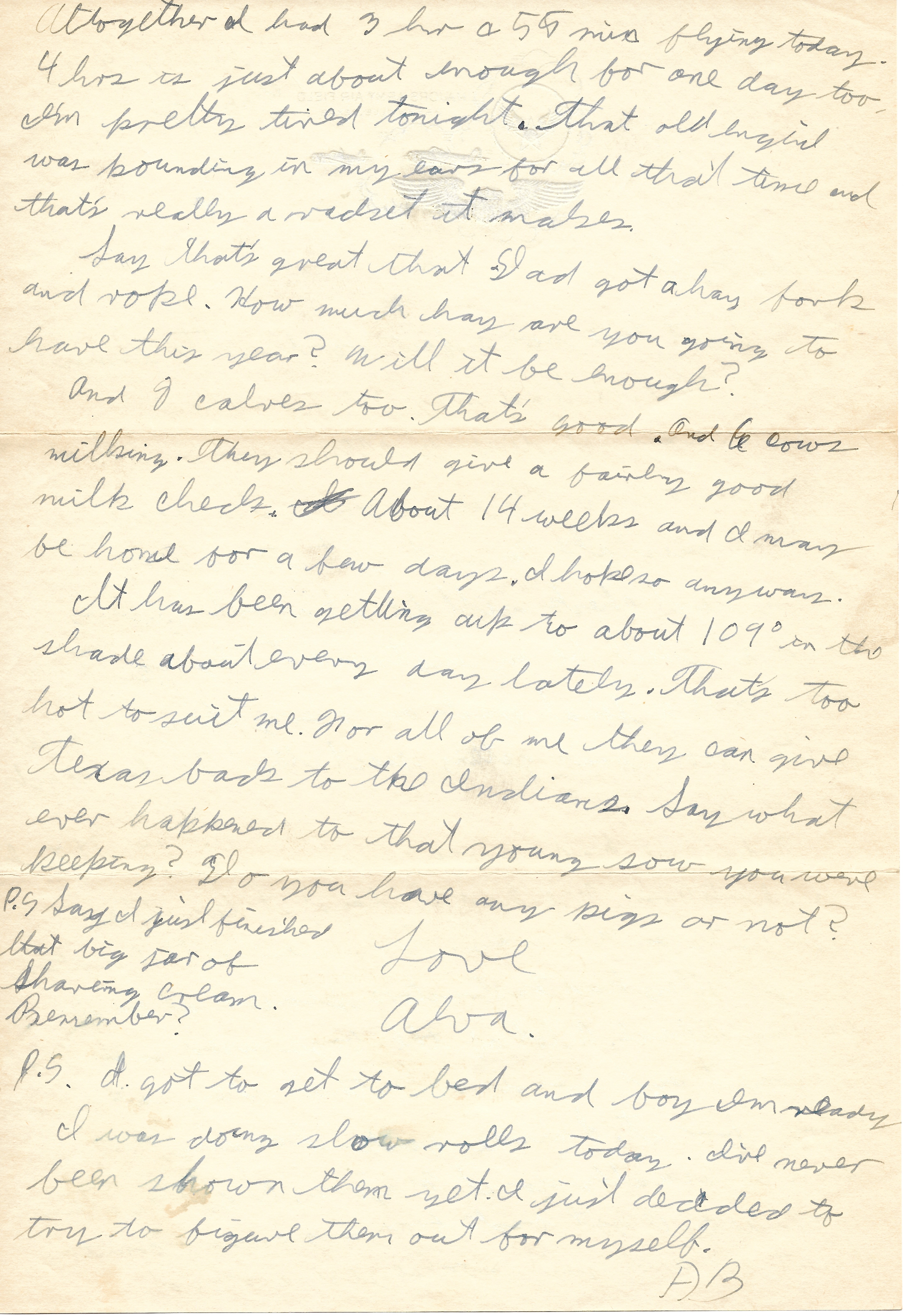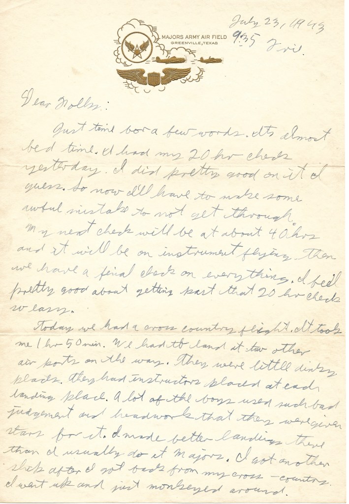 Just time for a few words. It’s almost bedtime. I had my 20 hr. check yesterday. I did pretty good on it I guess. So now I’ll have to make some awful mistake to not get through. My next check will be at about 40 hrs. and it will be on instrument flying. Then we have a final check on everything. I feel pretty good about getting past that 20 hr. check so easy.