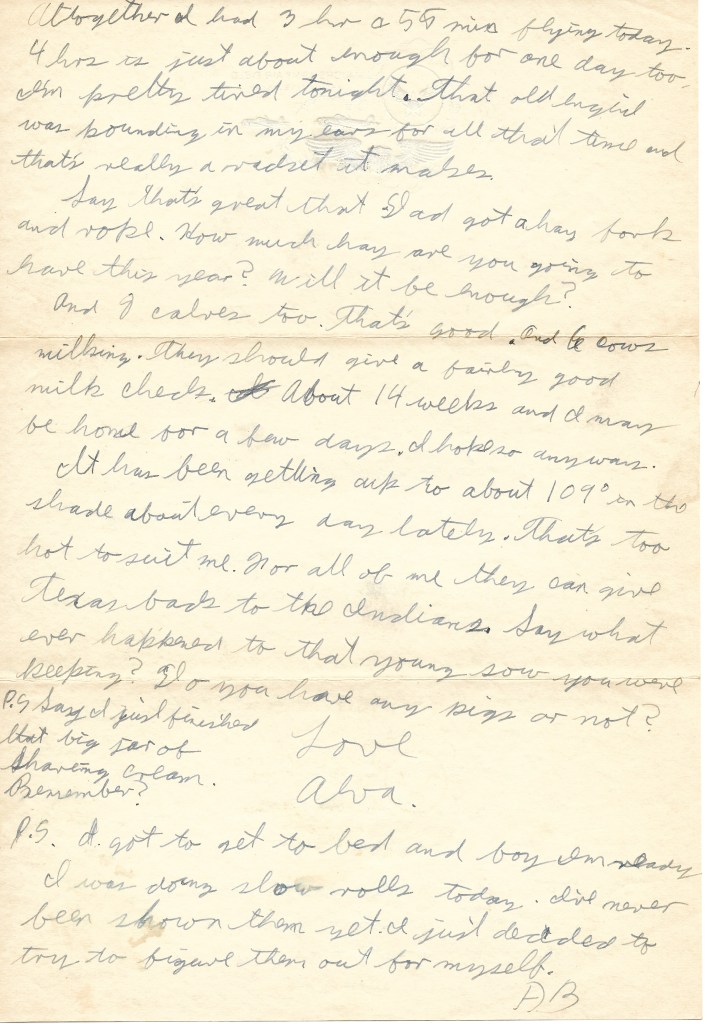 Altogether I had 3 hr. and 55 min. flying today. 4 hrs. is just about enough for one day too. I’m pretty tired tonight. That old engine was pounding in my ears for all that time and that’s really a racket it makes.
