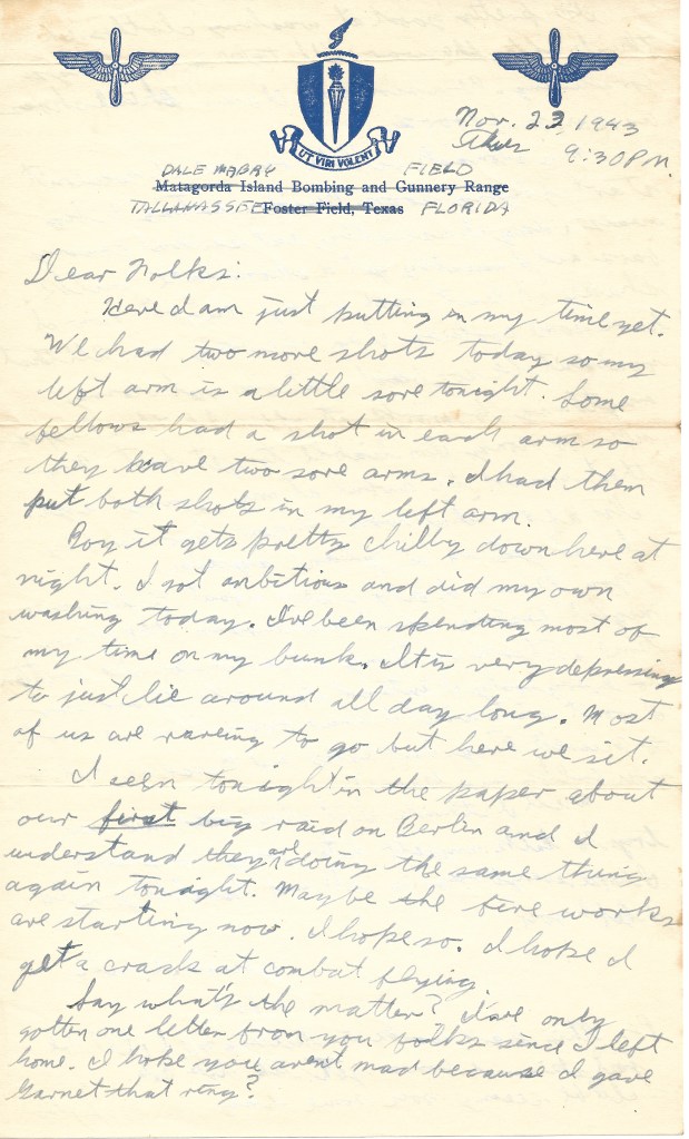 I saw tonight in the paper about our first big raid on Berlin, and I understand they are doing the same thing again tonight. Maybe the fireworks are starting now. I hope so. I hope I get a crack at combat flying.