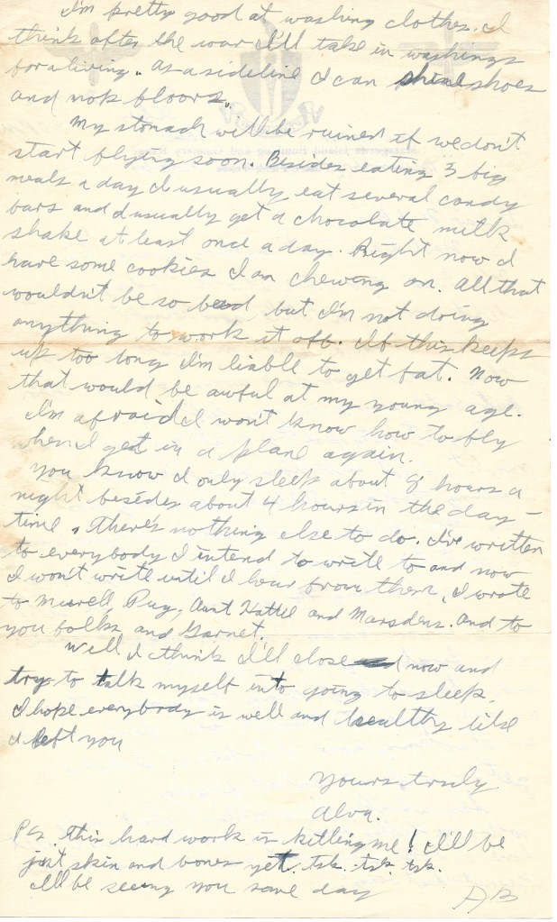 My stomach will be ruined if we don’t start flying soon. Besides eating 3 big meals a day, I usually eat several candy bars and I usually get a chocolate milk shake at least once a day. Right now I have some cookies I am chewing on. All that wouldn’t be so bad but I’m not doing anything to work it off. If this keeps up too long I’m liable to get fat. Now that would be awful at my young age. I’m afraid I won’t know how to fly when I get in a plane again.