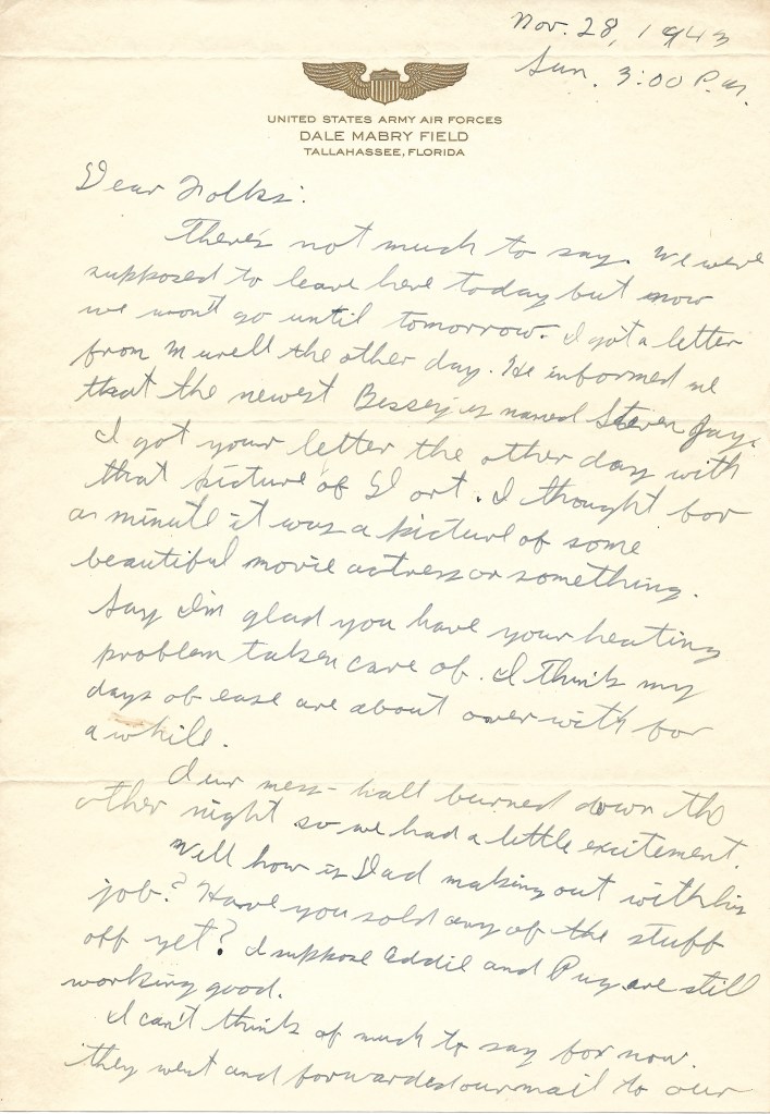 There’s not much to say. We were supposed to leave here today but now we won’t go until tomorrow. I got a letter from Murell the other day. He informed me that the newest Bessey is named Steven Jay. I got your letter the other day with that picture of Dort. I thought for a minute it was a picture of some beautiful movie actress or something.