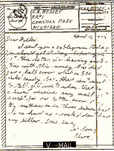 I sent you a cablegram today. You should get it before you get this letter. I’m having quite a time with this money. One kid gave a half crown which is 50 cents for a nickel candy bar. There isn’t much to tell. I’ll write when there is. I haven’t received any mail yet except one letter from Pug (?). My mattress is in three pieces and it is as hard as a rock. I don’t have any pillow. Some fun.