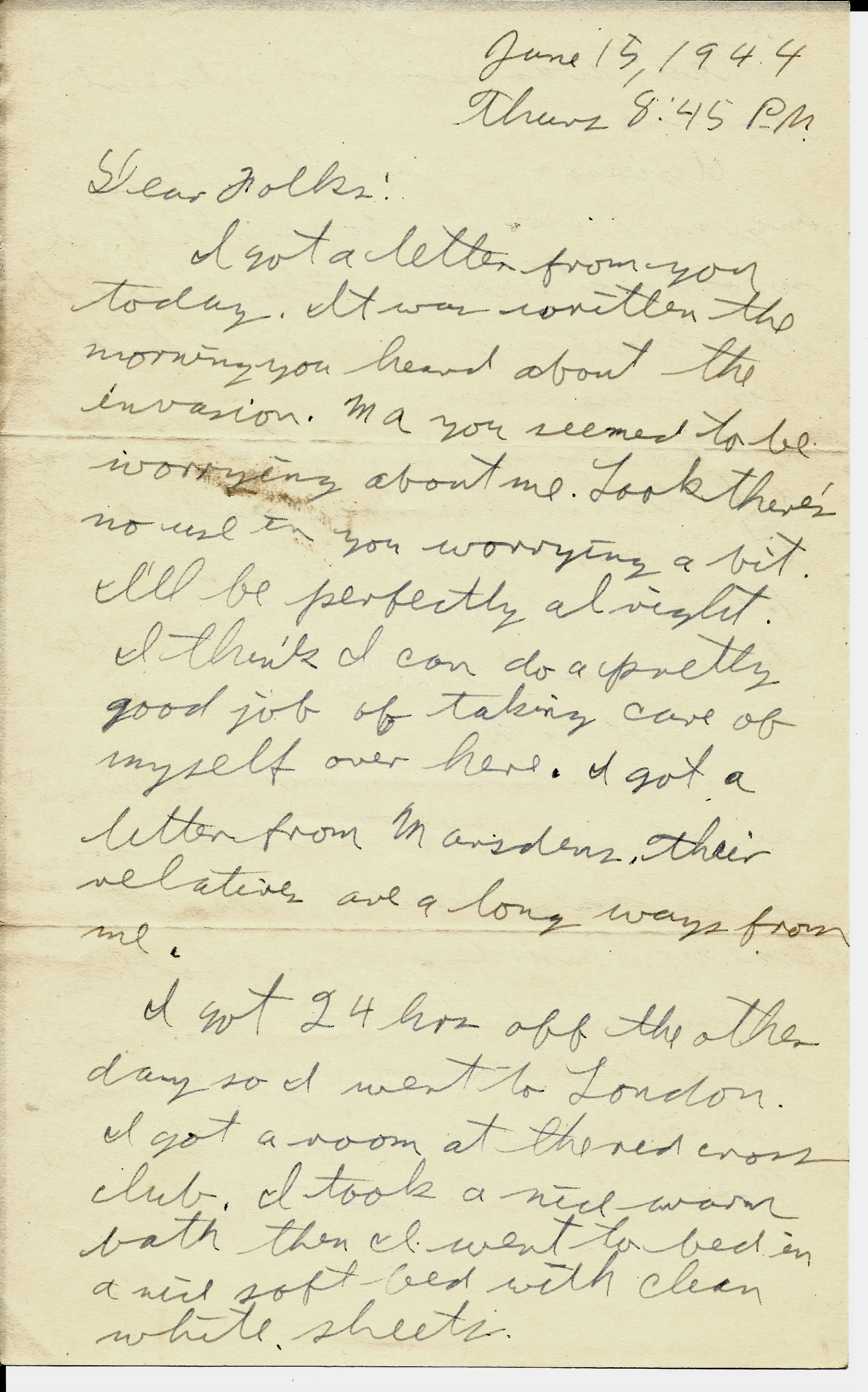 I got 24 hours off the other day so I went to London. I got a room at the Red Cross Club. I took a nice warm bath. Then I went to bed in a nice soft bed with clean white sheets. That was sort of a treat for me.