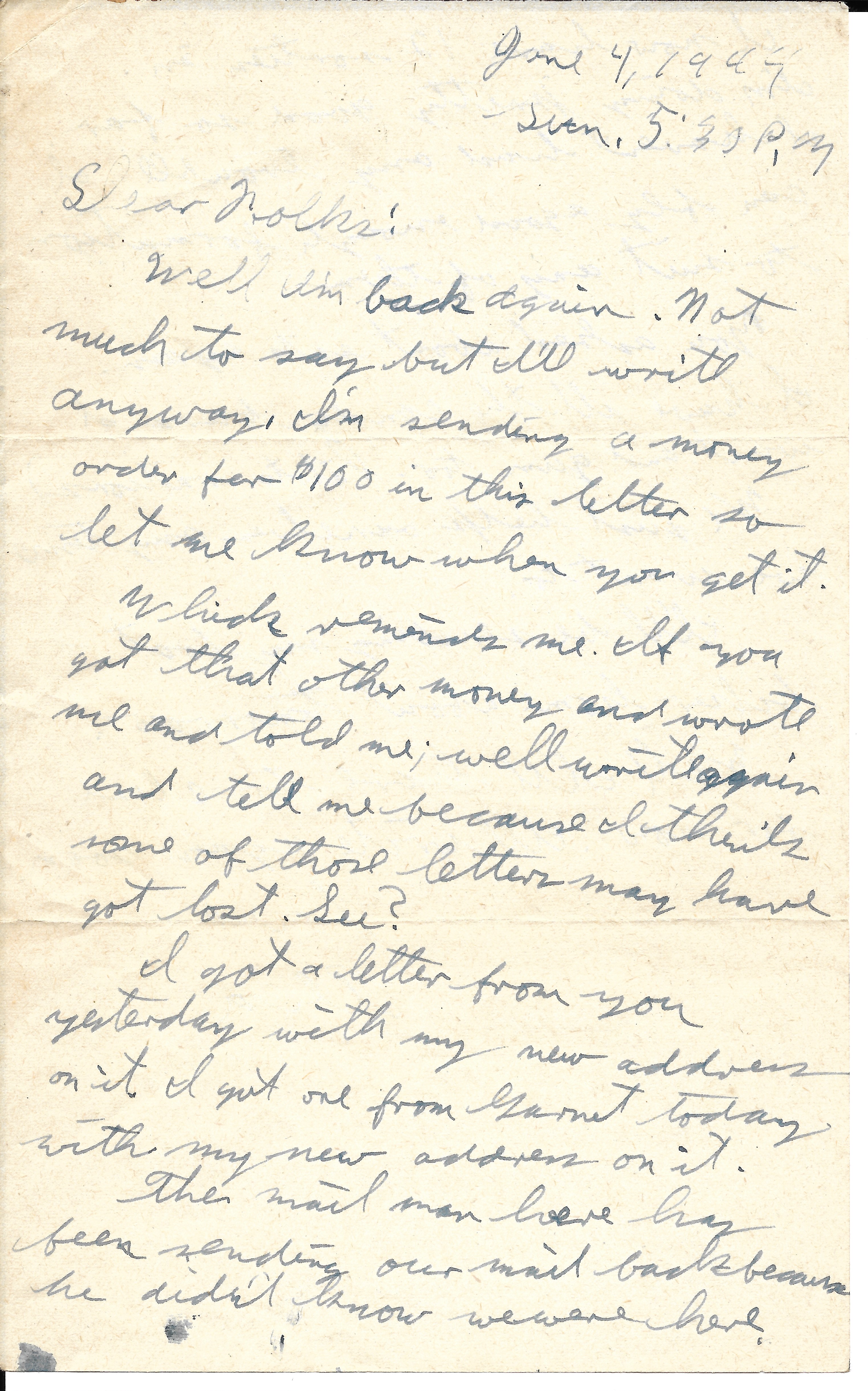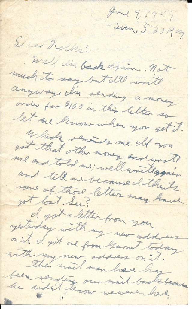 Well I’m back again. Not much to say but I’ll write anyway. I’m sending a money order for $100 in this letter so let me know when you get it. Which reminds me. If you got that other money and wrote me and told me, well write again and tell me because I think some of those letters may have got lost. See?